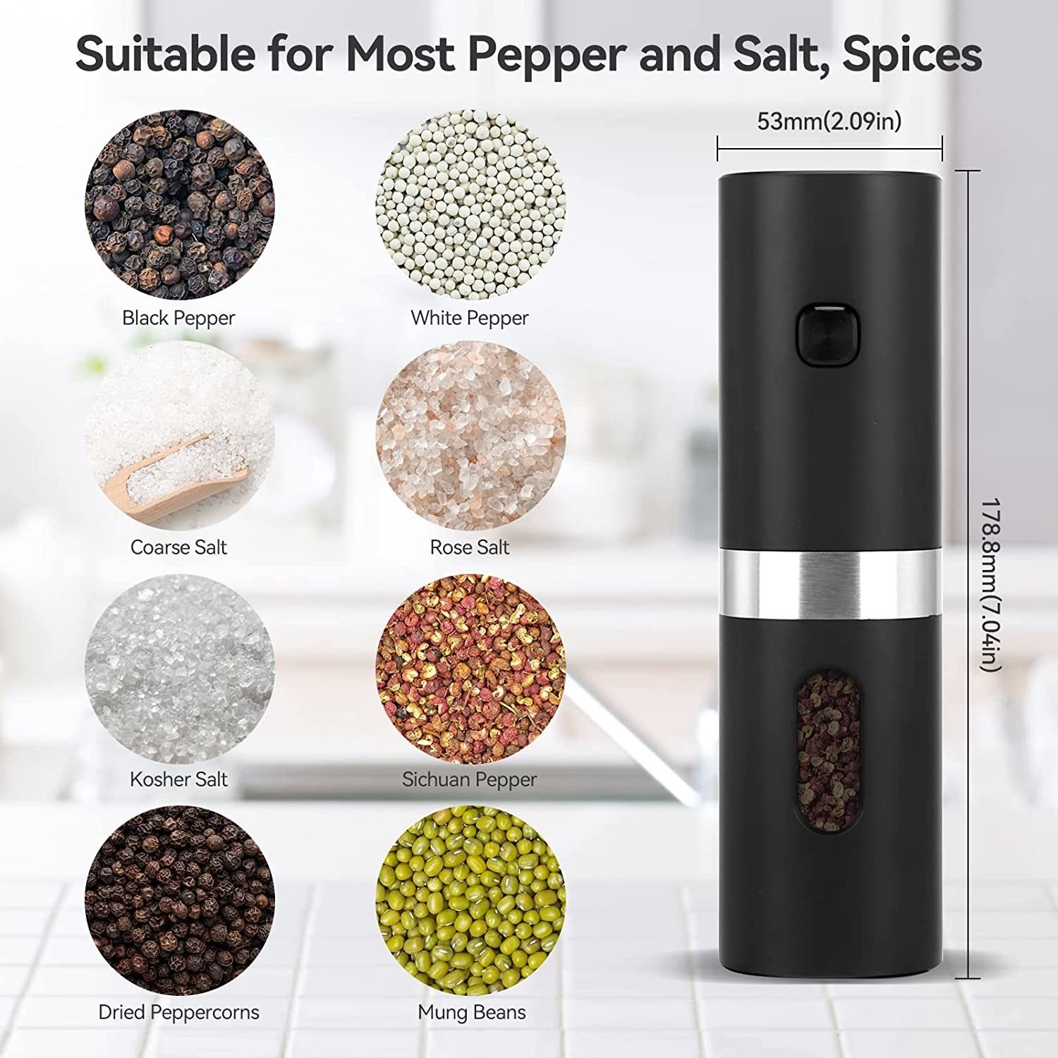 [USB Charging and Battery Dual Use - Salt and Pepper Grinder Set]- This electric salt and pepper grinder set has a built-in rechargeable 1200mAh (4*300mAh) battery; just put the grinder on the charging base to charge it.